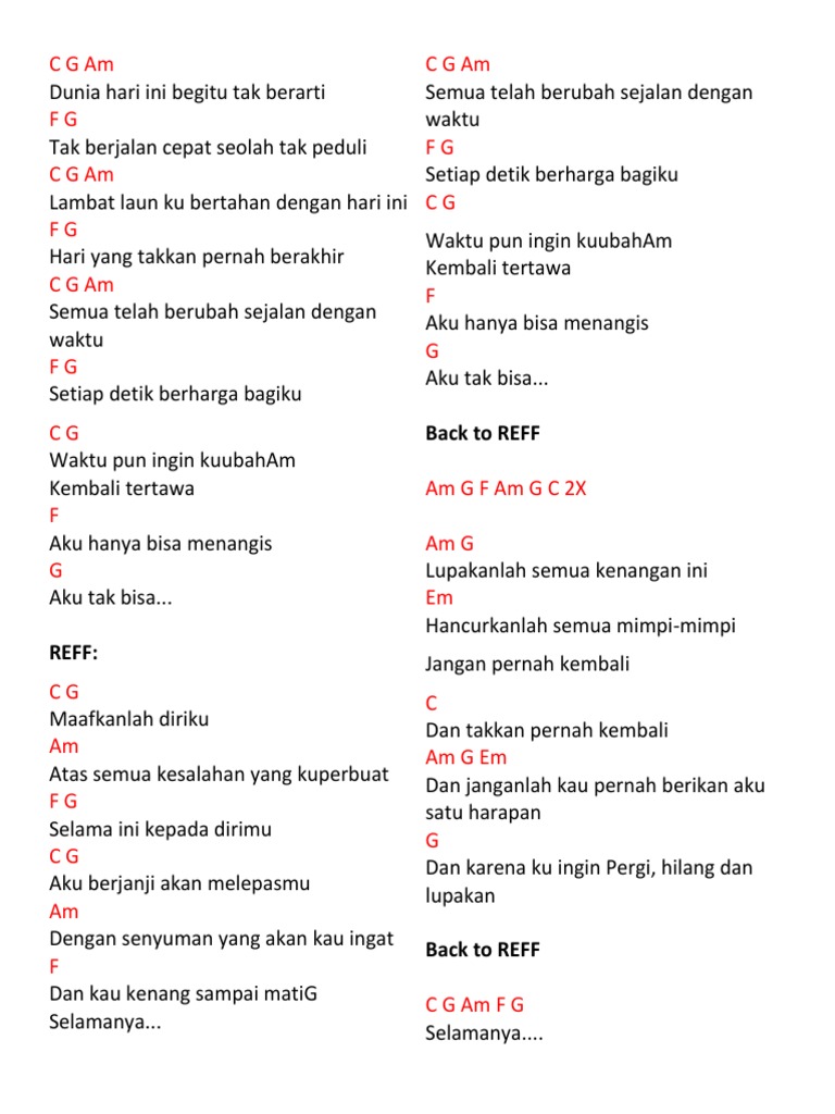 Am G F Am G C Am F lupakanlah semua kenangan ini C hancurkanlah semua mimpi-mimpi. Semua telah berubah sejalan dengan waktu Setiap detik berharga bagiku Waktu pun ingin kuubah kembali tertawa Aku hanya bisa menangis aku tak bisa. Hari yang tak akan F G C pernah berakhir.