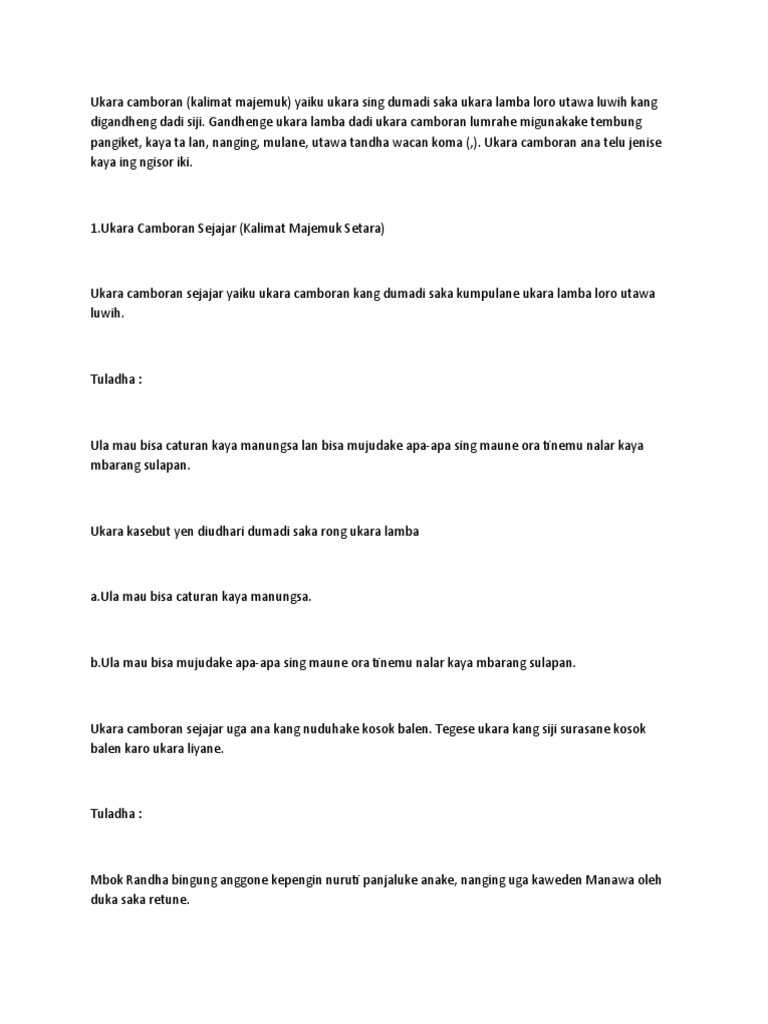 Detail Contoh Ukara Camboran PDF dapat kamu nikmati dengan cara klik link download dibawah dengan mudah tanpa iklan yang mengganggu. Ukara Camboran Sunggun Kalimat Majemuk Berangkat Yaiku ukara kang dumadi saka rong klausa utawa lewih nanging ana klausa sing dikuasani anak kalimat lan klausa sing nguasani induk kalimat dadi ana perangan kang dijemabarake diperluas bisa ing J W L utawa K. Manawi ukara lamba punika jejer lan wasesa namung satunggal ukara camboran boten kados makaten.
