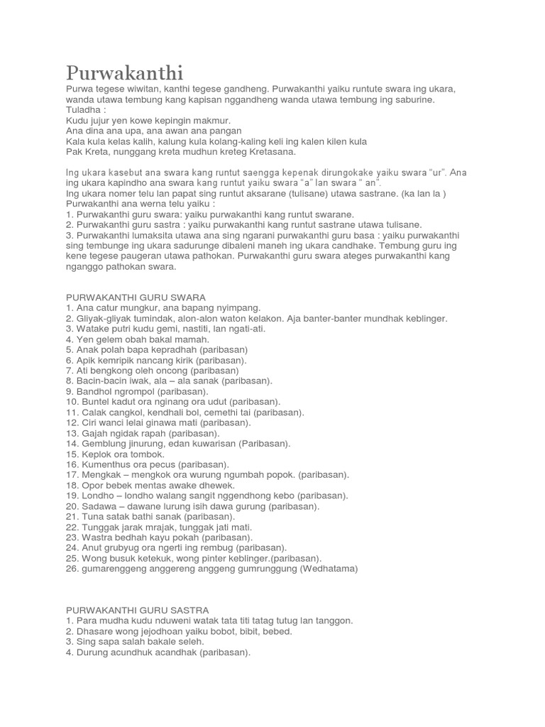 Contoh purwakanthi guru sastra dan guru swara pada kelas 10 x sma smk ma akan mendapatkan materi bahasa jawa inidi sini kita akan berbagi mengenai contoh kalimat kata pada purwakanthi guru sastra lan guru swara. Terdapat pengulangan konsonan g pada kata goroh dan growoh. Purwakanthi merupakan salah satu bagian dari karya sastra Jawa yang digunakan sejak ratusan tahun lalu.